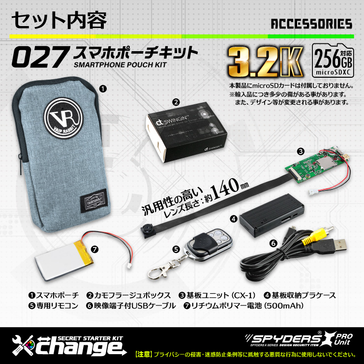 ◎オリジナルカメラの製作を完全サポートする新シリーズが遂に始動! ◎経験豊富な開発者がプロデュースするシークレットスターターキット! ◎特性や材質にこだわり、厳選された筐体とオリジナルツールをご提供! ◎スパイダーズXの直営工場で製造する完全オリジナルのカスタムキット! ◎これがセキュリティアイテム本家の実力!他には真似できない独自システム! ◎このオリジナル筐体はチェンジキットでしか手に入らない超レアアイテム! ◎身近なもの全てを「カメラ」にする!これが出来るのはスパイダーズXだけ! ★さりげなく自然に持てるファブリック調デザインのポータブルケース★ ★衝撃吸収クッションを採用しクラムシェル構造で大きく開いて使いやすい★ ★ケースの裏にベルトループとDカンが付いているので自由に身に着けられる★ ★フルハイを越えた美麗映像の超高解像度3.2K基板ユニットチェンジキット★ ○カモフラージュボックスに基板ユニットとバッテリーを格納! ○筐体の内側からレンズ穴にレンズをはめ込みレンズベルクロで固定&保護するだけ! ○レンズベルクロはレンズ取り付け後の脱落や回転防止のために使用! ○オリジナルワッペンでレンズ穴を加工!レンズを目立ちにくくしました! ○ケースはセミハードタイプでキットをスッキリと収納し衝撃から守ります。 ○リモコン付属で遠隔操作も可能なポータブルケースキット! ●基板保護ができる安心仕様の専用プラケース付!もちろん外しても使える! ●マイクロコネクタ搭載でいろんなサイズのリチウムポリマー電池が使える! ●USB接続でモバイルバッテリーやコンセントとももちろん接続可能! ●動体検知録画機能付なので動きをキャッチして自動で録画を開始! ●超大容量256GB対応でデータサイズの大きい3.2Kでも余裕の約32時間保存! ●高画質仕様のプロ向け本格モデルなのに初心者でも扱いやすい! 【1】3200×1800pxの超高精細な3.2Kを実現!2.3Kも選べる高解像度モデル! 【2】直径約2mmの超高性能小型レンズを採用!細部まで鮮明で高画質な映像! 【3】クリアな映像のまま従来の方式より2倍以上の圧縮効率を誇るH.264を採用! 【4】4Kサイズの4352×3264pxの高画質写真撮影!決定的瞬間を逃さない! 【5】暗視補正機能付で光が少ない室内でも自動的に露出を調整し明るく撮影! 【6】専用リモコンで遠隔操作!モード別に独立したボタンで操作性抜群! 【7】給電方法が多彩!目的に合ったバッテリーでカスタムが自在に楽しめる! 【8】外部電源&繰り返し録画&動体検知付で監視カメラとして留守中の防犯にも使える! 【9】PCに繋げばすぐデータ確認できる!microSDカードを取り出す手間がいらない! 【10】証拠の精密さを上げる撮影日時表示!設定ツール対応で簡単にPCの日時に自動設定! 【11】データ移動に便利なmicroSDカード採用!大容量256GB対応で長時間保存が可能に! 【12】外部出力機能付!テレビ画面でアングルを確認しながらの撮影が可能! ■今までの製品では満足できないオリジナリティ溢れるセキュリティアイテム! ■日々の生活の記録!ストーカーやセクハラ、DVや恐喝など身を守るための証拠収集に! ■決定的瞬間を逃さない!介護士やベビーシッターなどの虐待から大切な人を守るために! ■本製品は自分や大切な家族、財産等を守るための防犯用に使用することを目的としています。 ■スパイダーズXは実用性に特化した信頼のセキュリティアイテムを取り扱っています。 |