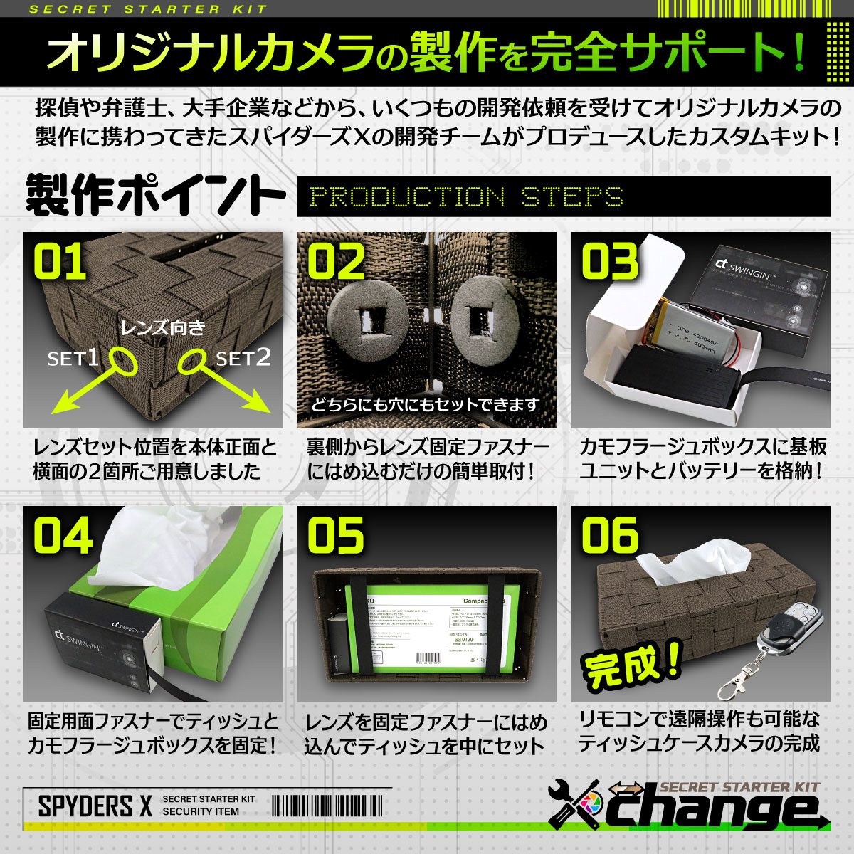 | 【セット内容】 | 1.ティッシュケース 2.固定用面ファスナー×2 3.カモフラージュボックス×2 4.基板ユニット(CX-1) 5.基板収納プラケース 6.専用リモコン 7.映像端子付USBケーブル 8.リチウムポリマー電池(500mAh) 9.日本語取扱説明書 |