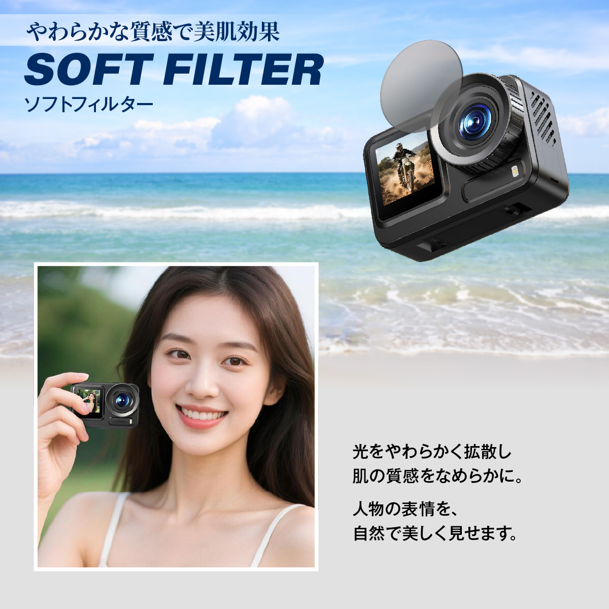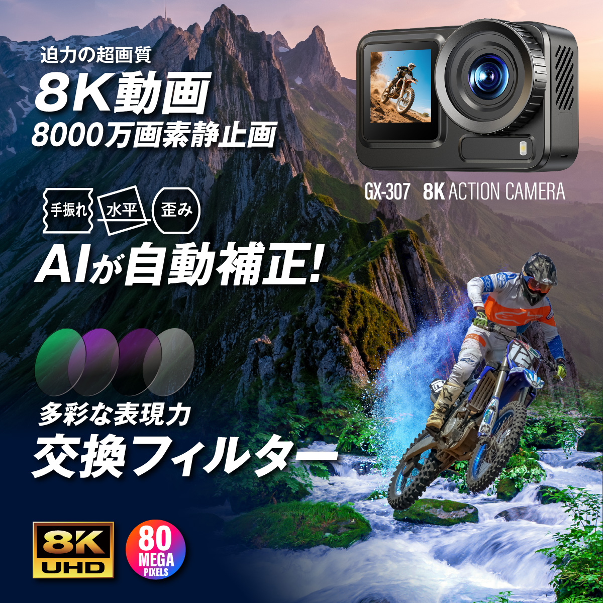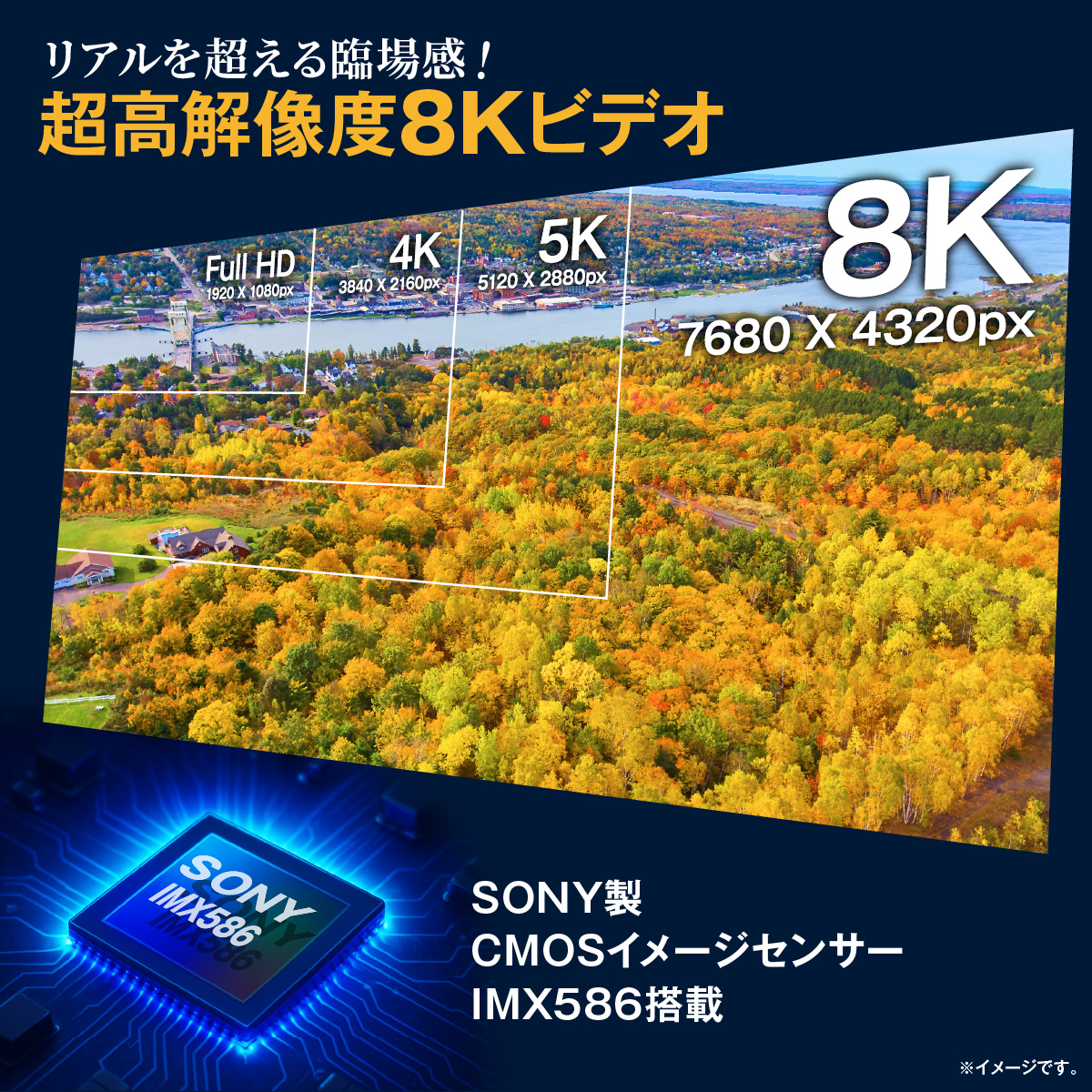 ★映像からの4K静止画切り出し編集にも耐えられる超高画質『8K』アクションカメラ!★ ★手ぶれ補正、水平補正、歪曲補正を『AI』が自動補正し、映像をクオリティアップ!★ ★CPL(偏光)、ND8/16(減光)、SOFT(柔光)、シーンに合わせた『4種類のフィルター』が付属!★ ★Wi-Fiでスマホ接続、SNSに最適な6K縦型動画、最大90秒のプリ録画など充実の機能!★ |