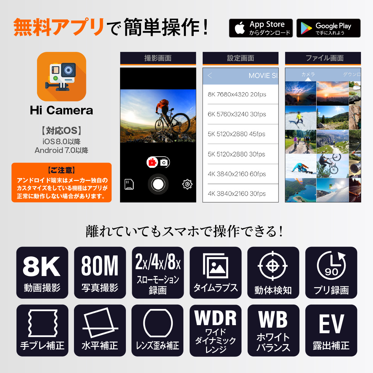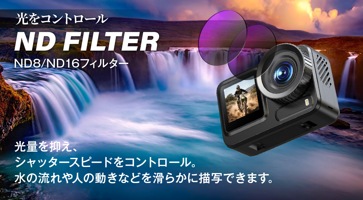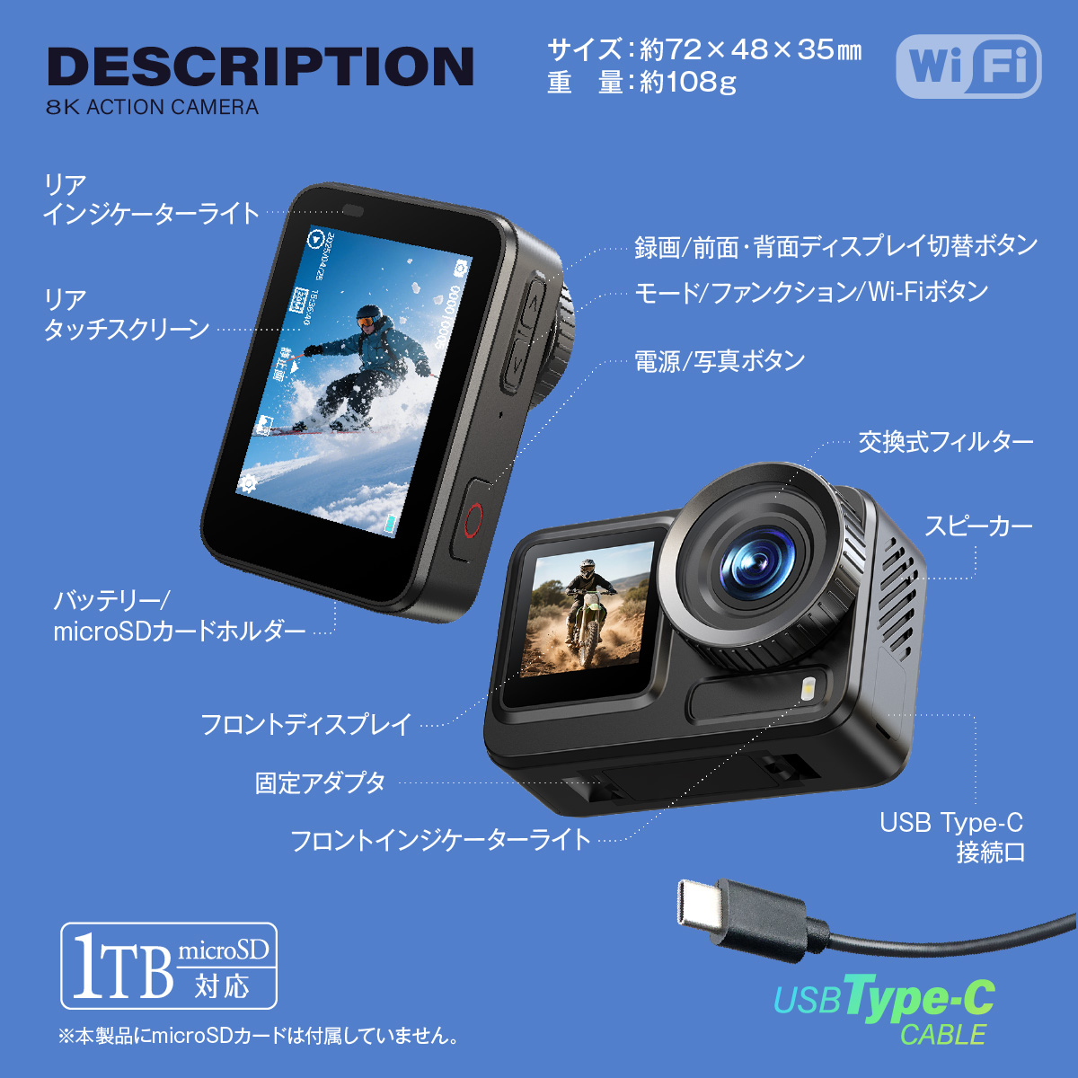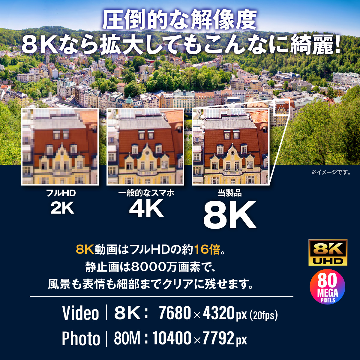 ★映像からの4K静止画切り出し編集にも耐えられる超高画質『8K』アクションカメラ!★ ★手ぶれ補正、水平補正、歪曲補正を『AI』が自動補正し、映像をクオリティアップ!★ ★CPL(偏光)、ND8/16(減光)、SOFT(柔光)、シーンに合わせた『4種類のフィルター』が付属!★ ★Wi-Fiでスマホ接続、SNSに最適な6K縦型動画、最大90秒のプリ録画など充実の機能!★ |