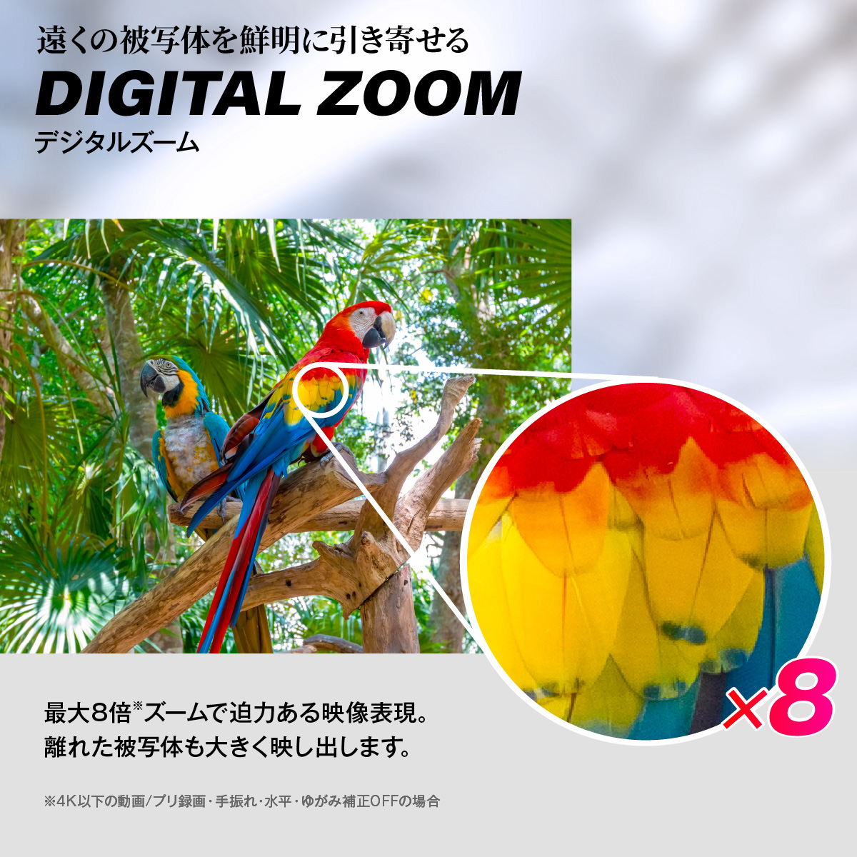 ・動画撮影 ・写真撮影 ・手ブレ補正 ・水平補正 ・レンズ歪み補正 ・交換式フィルター ・8倍デジタルズーム ・Wi-Fi接続(ダイレクト接続) ・スマホ操作 ・縦型動画 ・動体検知 ・プリ録画 ・ポスト録画 ・タイムラプス撮影 ・スローモーション録画 ・インターバル写真 ・連続撮影 ・繰り返し録画 ・ワイドダイナミックレンジ ・ホワイトバランス ・露出補正 ・映像回転 ・外部電源 ・リムーバブルディスク機能 |