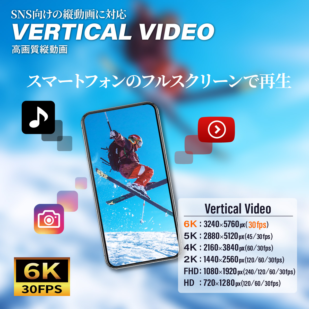 8K:7680×4320px(20fps) 6K:5760×3240px(30fps) 5K:5120×2880px(45/30fps) 4K:3840×2160px(60/30fps) 2K:2560×1440px(120/60/30fps) FHD:1920×1080px(240/120/60/30fps) HD:1280×720px(120/60/30fps) 縦型:6K、5K、4K、2K、FHD、HD |