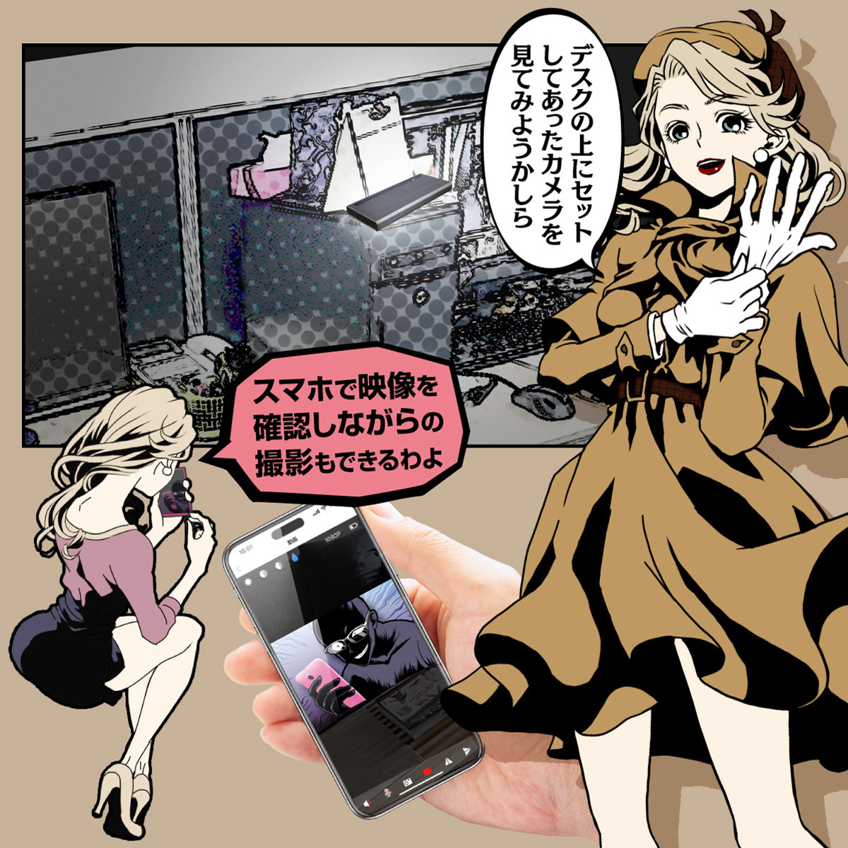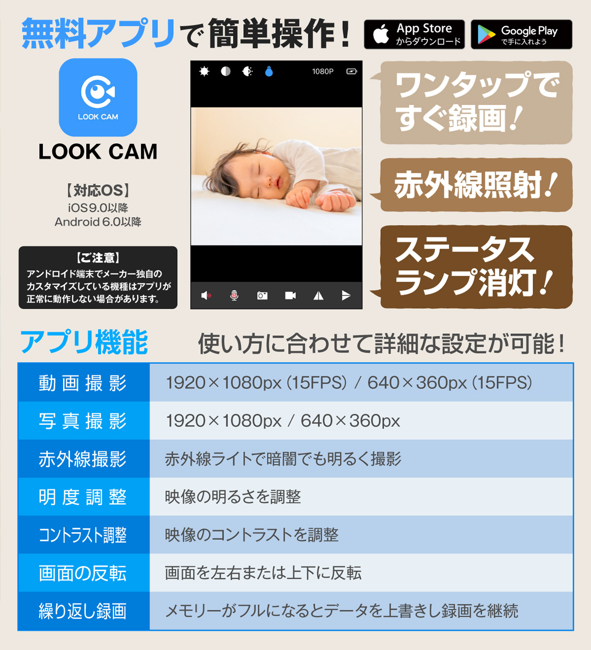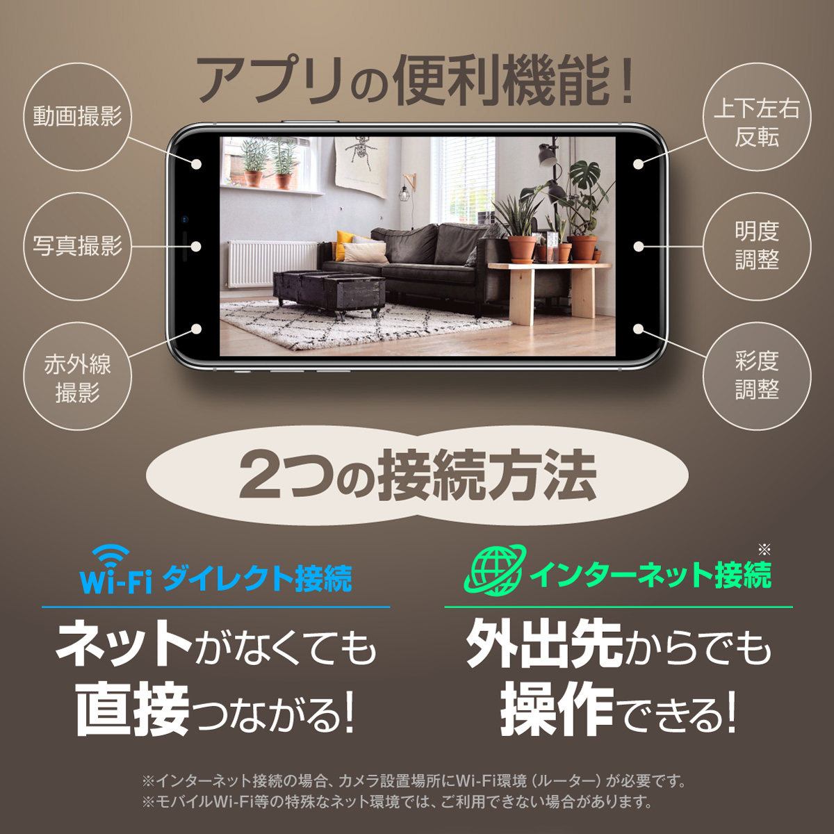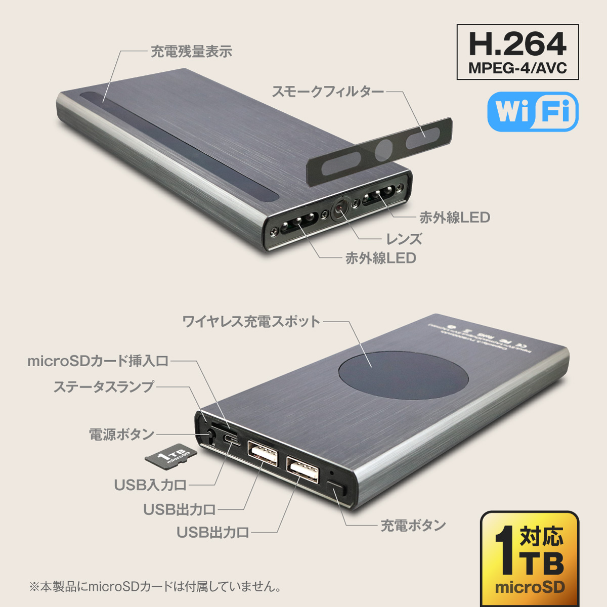 ・動画撮影 ・写真撮影 ・赤外線撮影(不可視) ・繰り返し録画 ・外部電源 ・オート録画 ・外部充電(USB/ワイヤレス) ・Wi-Fi接続(ダイレクト接続/インターネット接続) ※一部機能はスマホ等によるアプリでの操作が必要となります。 |