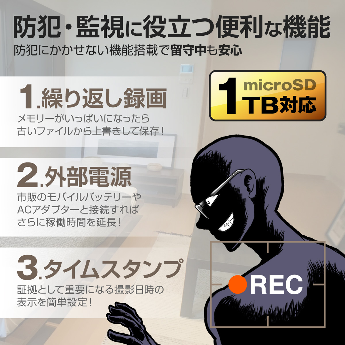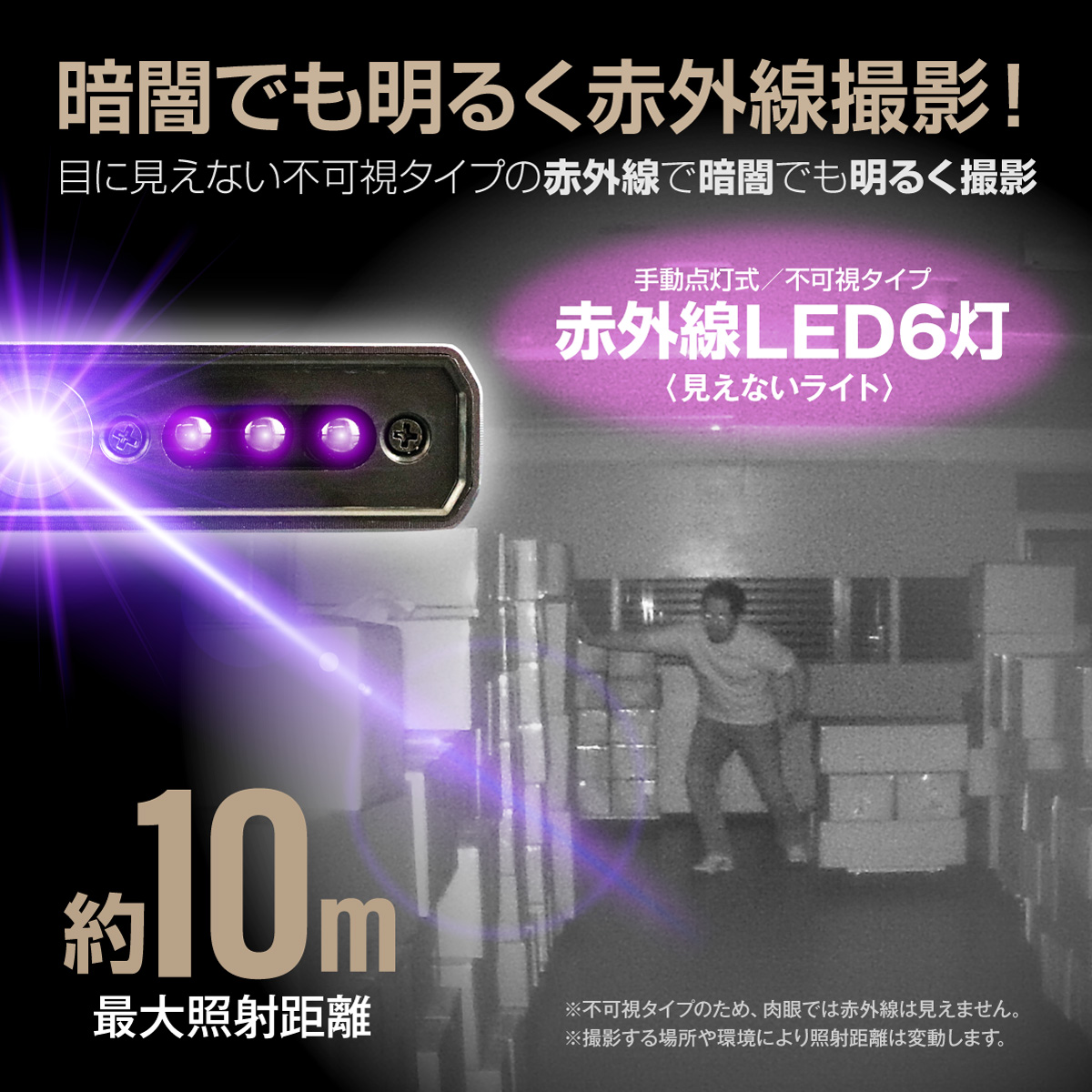 ★外出先からでもWi-Fi接続でネットワーク越しにモニタリングできる!★ ★約10mの強力赤外線ライトを搭載!暗闇での証拠撮影も明るく映し出します!★ ★大容量バッテリー内蔵で最大15時間稼働!1TB対応で長時間の録画保存も可能!★ |
