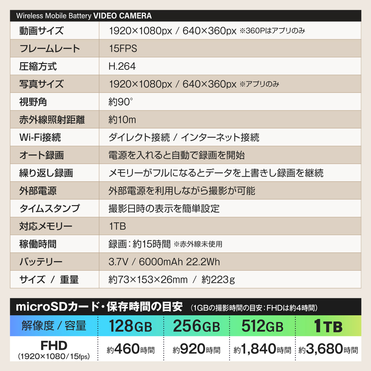 | 【稼働時間】 | 録画:約15時間(赤外線未使用) ※バッテリー稼働時間は理論値であり稼働時間を保証するものではありません。 |