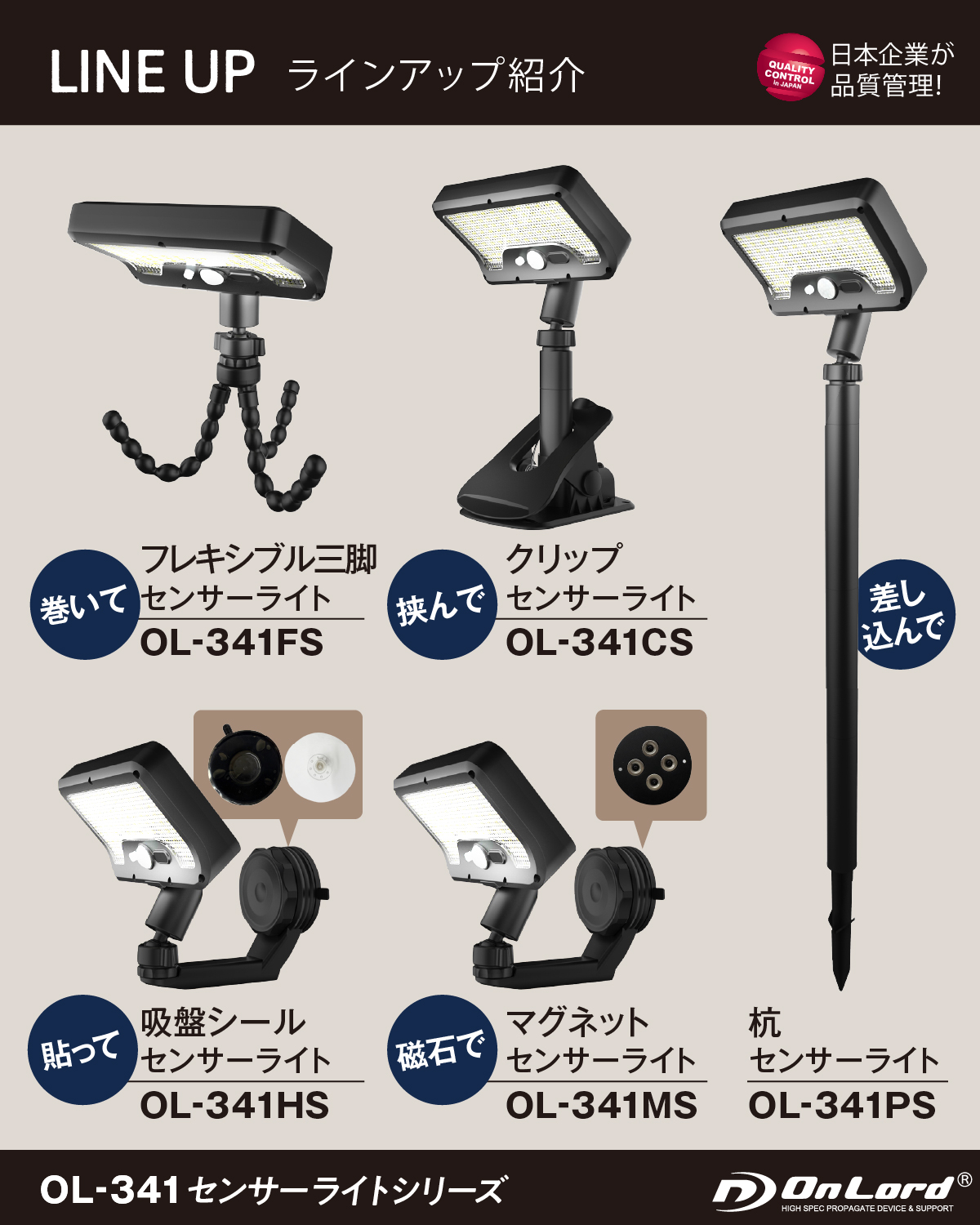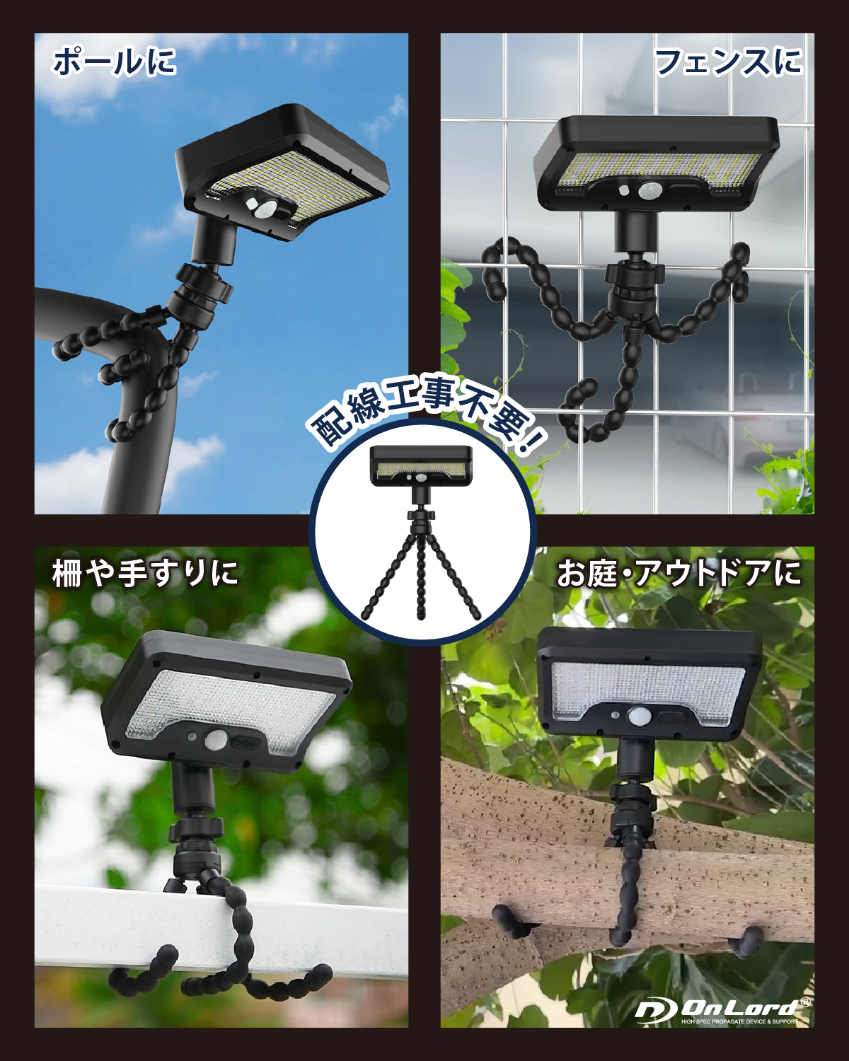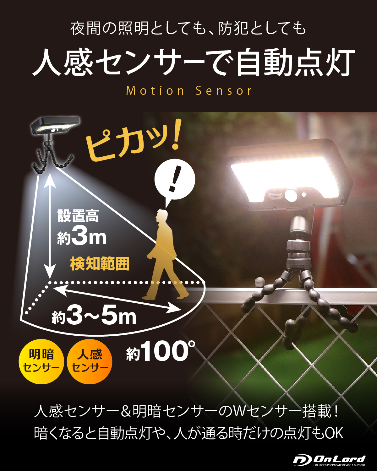 【巻くだけ設置】くねくね曲がる三脚でどこでも自由自在に設置!配線工事不要! 【人感センサー搭載】人感センサーと明暗センサーのWセンサー搭載!暗くなり人が近づくと自動点灯・消灯。92個のLED最大500ルーメンの明るさ!常時点灯も可能、連続発光約6~8時間。夜間の照明や防犯対策に最適。 【ソーラー充電&USB充電の2WAY充電】昼間はソーラー充電で電気代0円!天候不順が続いてもUSB Type-C充電が可能!地震や台風等で停電時の照明にも。 【360度角度調整】ライトの角度は上下45度左右360度回転!自由自在に照らす 【防塵防水IP65】雨でも安心。玄関、庭、ベランダ、駐車場など屋外に最適 【3つの点灯モード】・微灯モード:人を検知すると500ルーメンで発光、15秒後に20ルーメンの明るさに戻る・消灯モード:人を検知すると500ルーメンで発光、15秒後に消灯・消灯モード:周囲が暗くなると50ルーメンで常時点灯 【ライトは5種類のアタッチメント対応】ライトはOL-341Fシリーズの「フレキシブル三脚・クリップ・杭・吸盤シール・マグネット」の5つのアタッチメントに取り付け可能。シーンに合わせて自由に設置。 |
