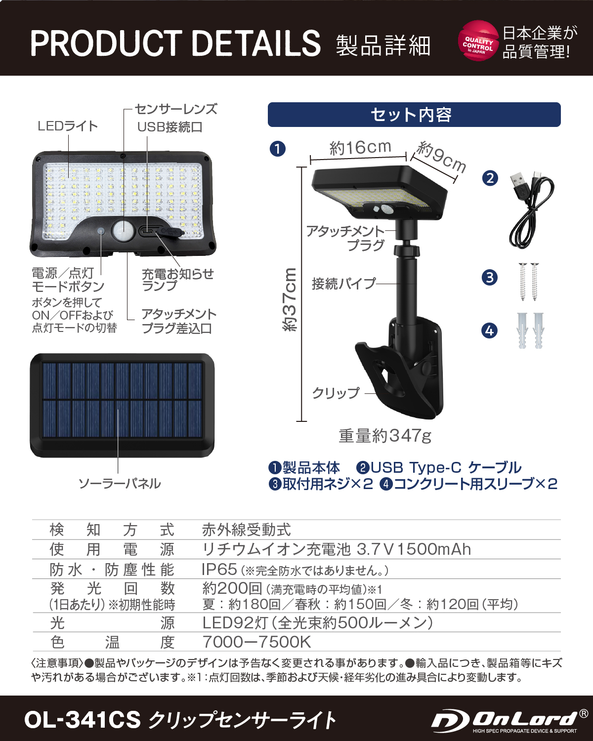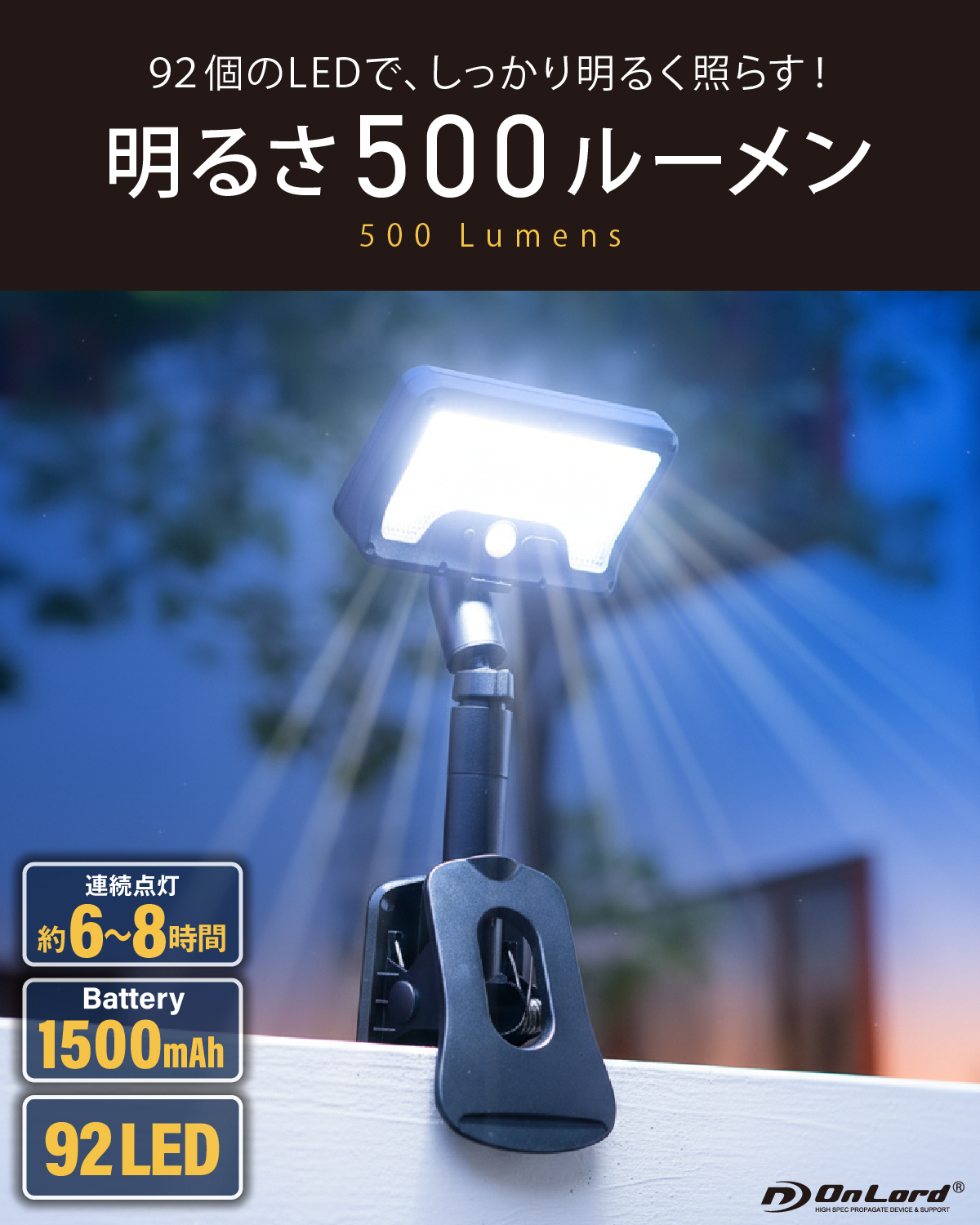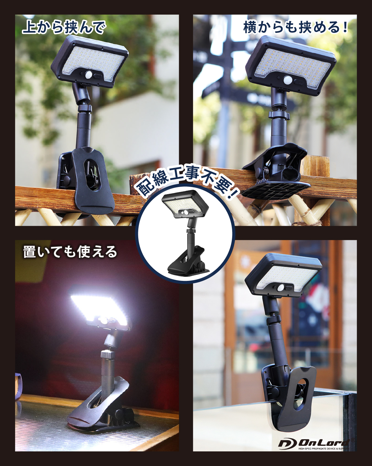 【クリップ設置】クリップで挟んでどこでも自由自在に設置!上からも横からも挟める!置いて使用も可能!配線工事不要! 【人感センサー搭載】人感センサーと明暗センサーのWセンサー搭載!暗くなり人が近づくと自動点灯・消灯。92個のLED最大500ルーメンの明るさ!常時点灯も可能、連続発光約6~8時間。夜間の照明や防犯対策に最適。 【ソーラー充電&USB充電の2WAY充電】昼間はソーラー充電で電気代0円!天候不順が続いてもUSB Type-C充電が可能!地震や台風等で停電時の照明にも。 【360度角度調整】ライトの角度は上下45度左右360度回転!自由自在に照らす 【防塵防水IP65】雨でも安心。玄関、庭、ベランダ、駐車場など屋外に最適 【3つの点灯モード】・微灯モード:人を検知すると500ルーメンで発光、15秒後に20ルーメンの明るさに戻る・消灯モード:人を検知すると500ルーメンで発光、15秒後に消灯・消灯モード:周囲が暗くなると50ルーメンで常時点灯 【ライトは5種類のアタッチメント対応】ライトはOL-341Fシリーズの「フレキシブル三脚・クリップ・杭・吸盤シール・マグネット」の5つのアタッチメントに取り付け可能。シーンに合わせて自由に設置。 |
