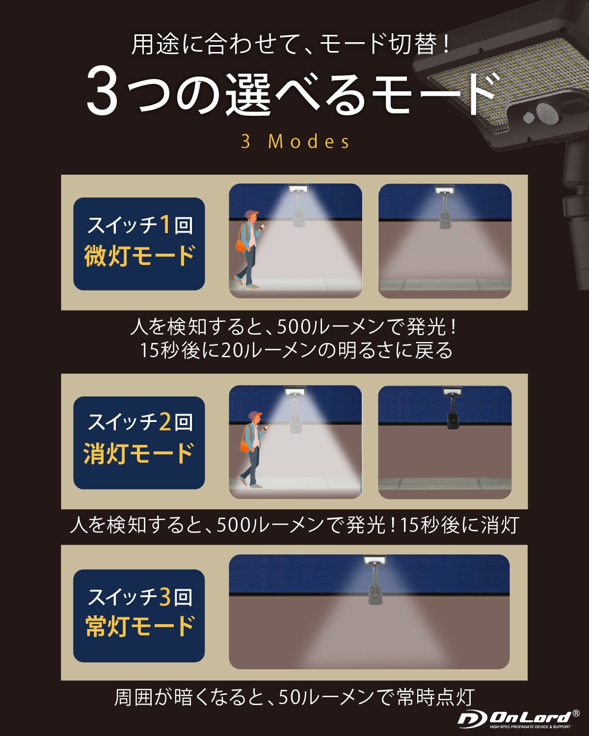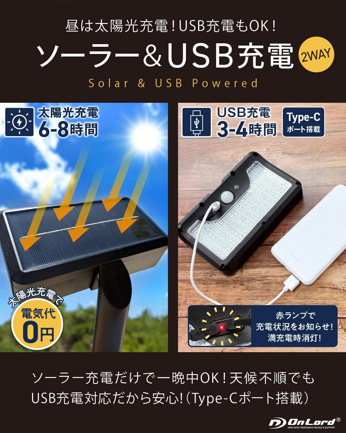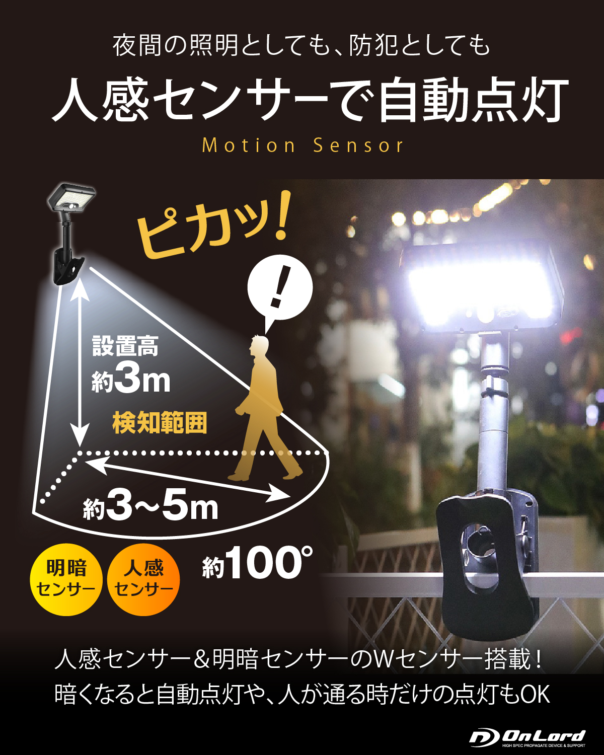 【クリップ設置】クリップで挟んでどこでも自由自在に設置!上からも横からも挟める!置いて使用も可能!配線工事不要! 【人感センサー搭載】人感センサーと明暗センサーのWセンサー搭載!暗くなり人が近づくと自動点灯・消灯。92個のLED最大500ルーメンの明るさ!常時点灯も可能、連続発光約6~8時間。夜間の照明や防犯対策に最適。 【ソーラー充電&USB充電の2WAY充電】昼間はソーラー充電で電気代0円!天候不順が続いてもUSB Type-C充電が可能!地震や台風等で停電時の照明にも。 【360度角度調整】ライトの角度は上下45度左右360度回転!自由自在に照らす 【防塵防水IP65】雨でも安心。玄関、庭、ベランダ、駐車場など屋外に最適 【3つの点灯モード】・微灯モード:人を検知すると500ルーメンで発光、15秒後に20ルーメンの明るさに戻る・消灯モード:人を検知すると500ルーメンで発光、15秒後に消灯・消灯モード:周囲が暗くなると50ルーメンで常時点灯 【ライトは5種類のアタッチメント対応】ライトはOL-341Fシリーズの「フレキシブル三脚・クリップ・杭・吸盤シール・マグネット」の5つのアタッチメントに取り付け可能。シーンに合わせて自由に設置。 |