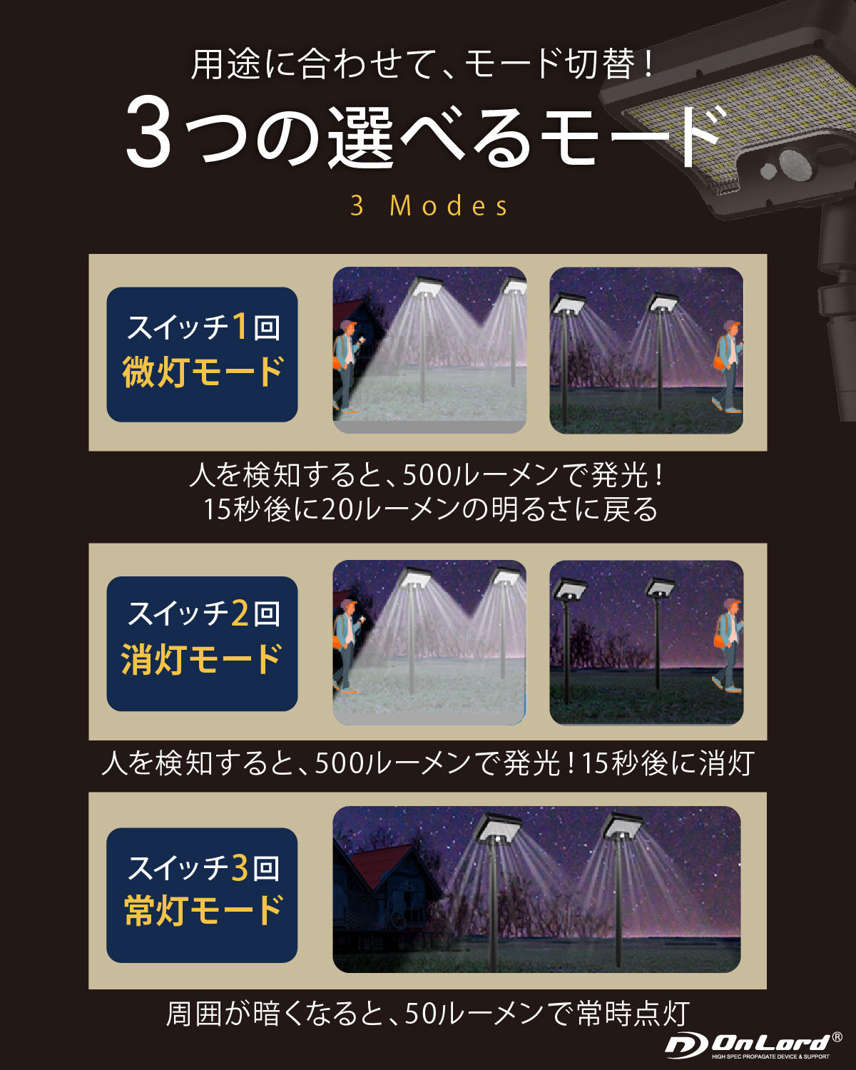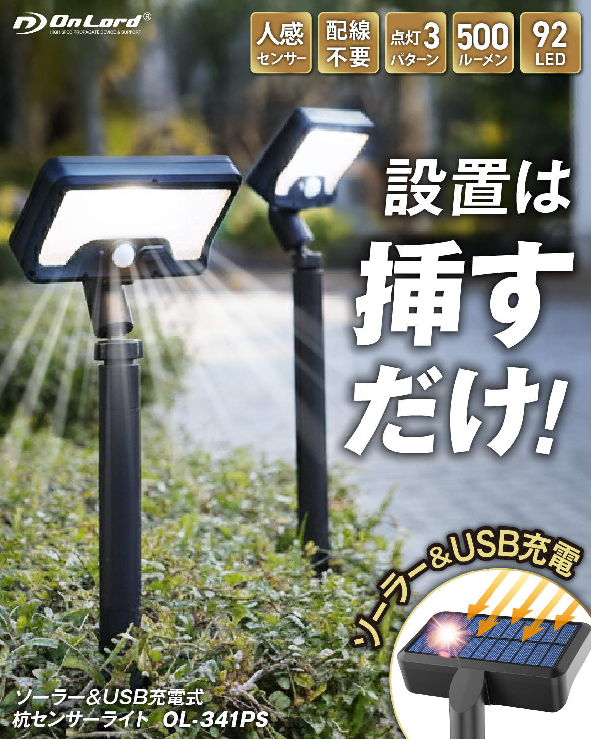 【挿すだけ設置】杭でお庭などに挿してどこでも自由自在に設置!配線工事不要 【人感センサー搭載】人感センサーと明暗センサーのWセンサー搭載!暗くなり人が近づくと自動点灯・消灯。92個のLED最大500ルーメンの明るさ!常時点灯も可能、連続発光約6~8時間。夜間の照明や防犯対策に最適。 【ソーラー充電&USB充電の2WAY充電】昼間はソーラー充電で電気代0円!天候不順が続いてもUSB Type-C充電が可能!地震や台風等で停電時の照明にも。 【360度角度調整】ライトの角度は上下45度左右360度回転!自由自在に照らす 【防塵防水IP65】雨でも安心。玄関、庭、ベランダ、駐車場など屋外に最適 【3つの点灯モード】・微灯モード:人を検知すると500ルーメンで発光、15秒後に20ルーメンの明るさに戻る・消灯モード:人を検知すると500ルーメンで発光、15秒後に消灯・消灯モード:周囲が暗くなると50ルーメンで常時点灯 【ライトは5種類のアタッチメント対応】ライトはOL-341Fシリーズの「フレキシブル三脚・クリップ・杭・吸盤シール・マグネット」の5つのアタッチメントに取り付け可能。シーンに合わせて自由に設置。 |